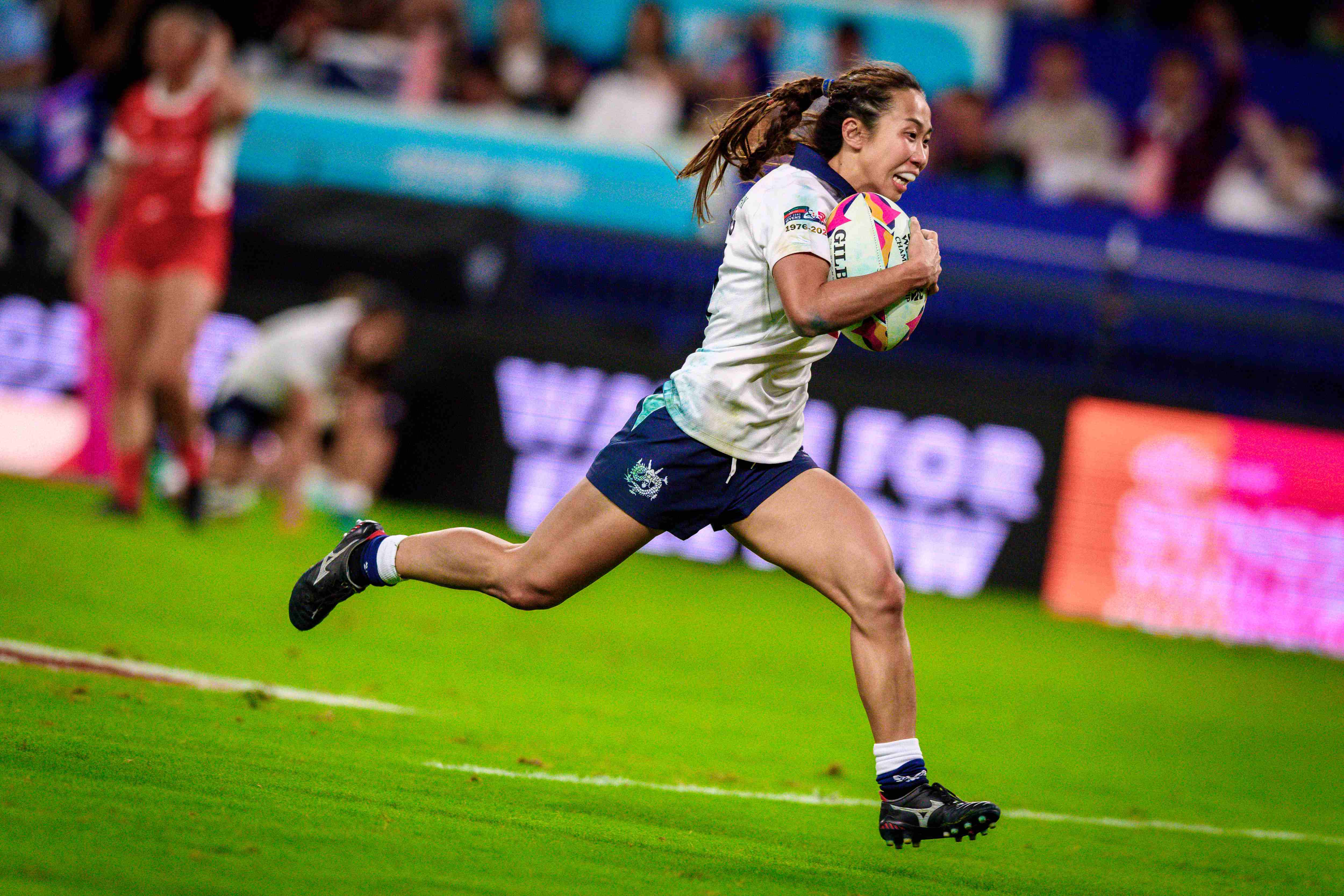There was a 5th-minute TMO check on a potential high hit from the team in red, but no foul play took place. When Hong Kong China had the ball, the girls looked to create chances, but small handling errors meant there was a lack of continuity. The vocal crowd urged the team on.
